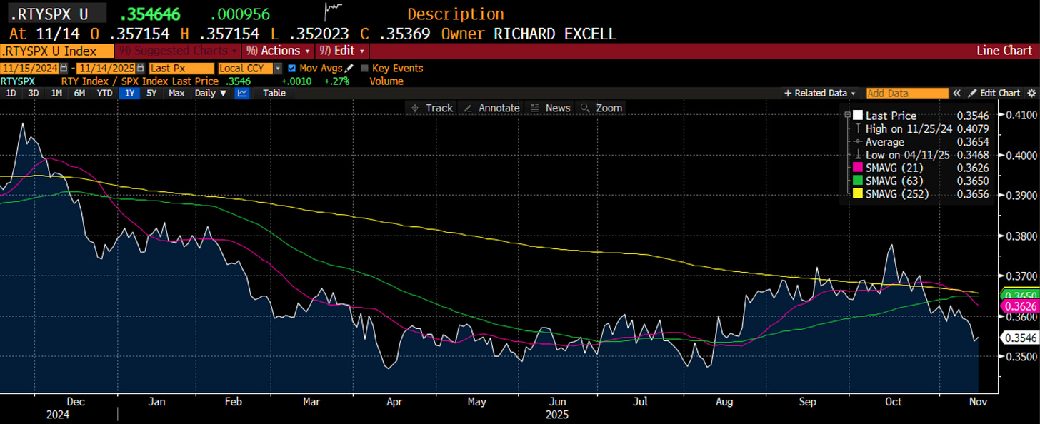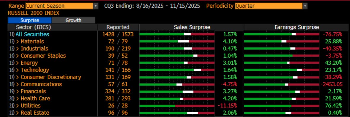 This was not the case in the Russell 2000. Midway through earnings, they were looking quite good. The last two weeks of small cap earnings have seen some bad misses. Also the communications sector, which is worth highlighting. However, earnings did not carry small caps. There were positive surprises in the S&P 600 (not shown) but I highlight the Russell 2000 as this is where the index/ETF money usually flows. With no rate cuts and earnings like this, it is hard to see why anyone shifts 401k money to small caps in January.