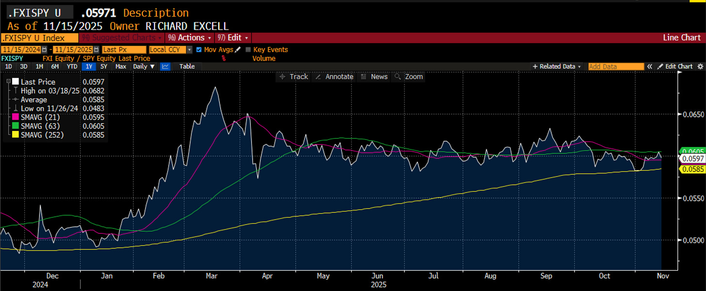 The preferred vehicle form many has been a clear shift into EM, of which China is a part of course. The performance of EEM vs. SPY has been more pronounced and this relative chart is now breaking out. If you want to shift anywhere on some nervousness in the US, EM broadly speaking is the place to look.