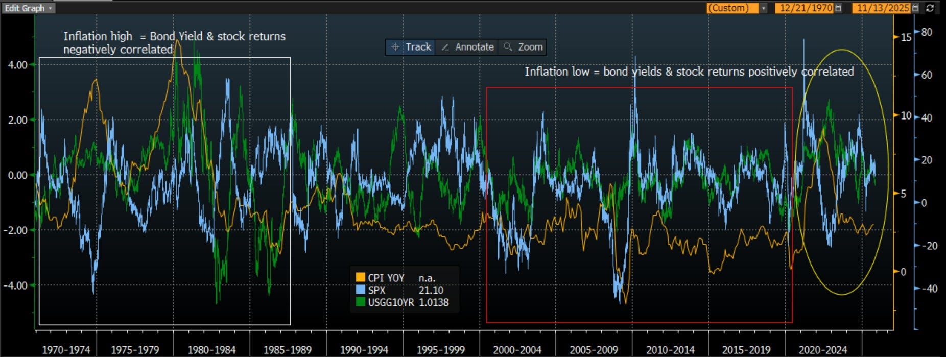 However, when the market is focused on inflation, as it was in the 70s-80s, when inflation is high, stock returns will suffer as margins erode and bond returns will also suffer (yields higher) as the Fed is expected to hike. When inflation falls, stocks get margins back and bond returns are strong with yields falling
