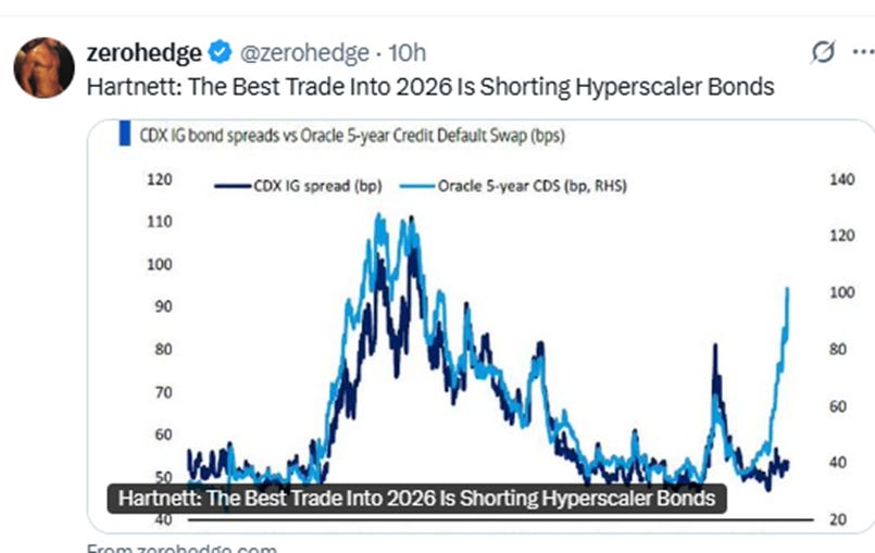 Many bears are wondering if this is it, if this is the big one. Has AI gone too far, with 80% of FCF being spent on capex? What used to be cash-rich companies that did not resemble the risk characteristics of the rest of tech, have now become a levered bet on whether the pursuit of AGI even makes sense. Michael Hartnett of BAML says the trade of 2026 is to short the bonds of the hyperscalers: