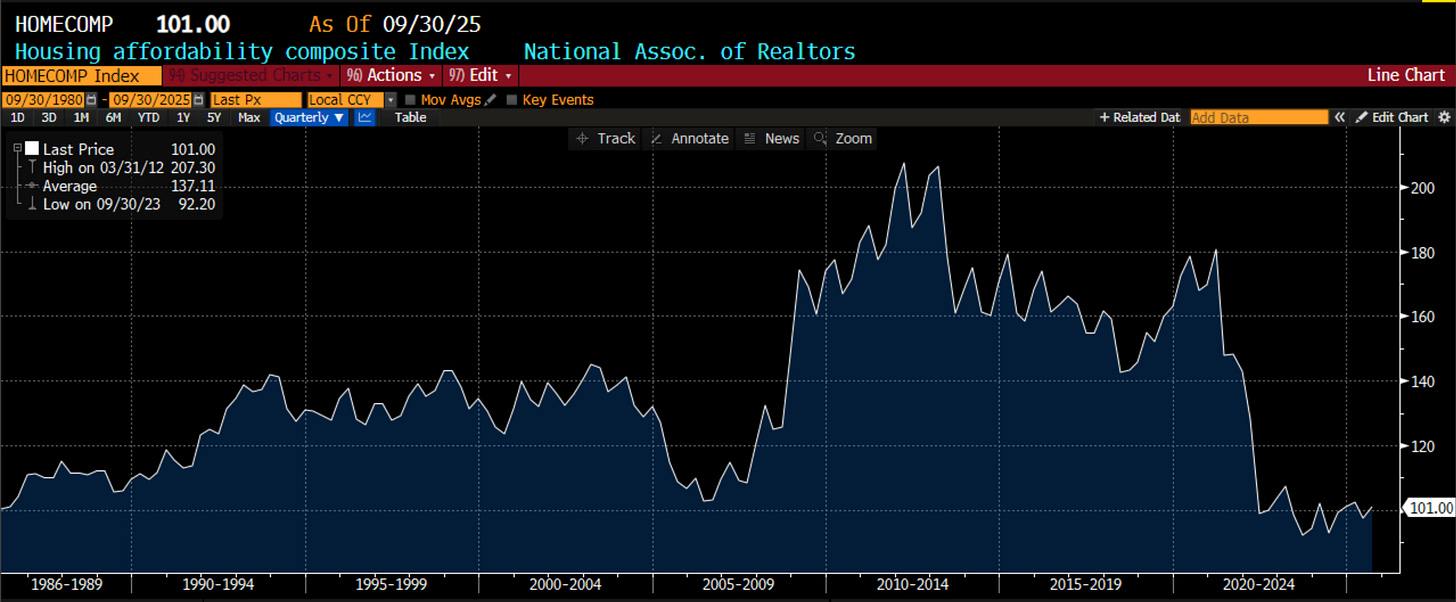The one of these that I can track the longest is housing affordability. It is still the worst of the last 40 years. It has barely changed despite 150 bps of Fed cuts. It has little to do with mortgages. It has a lot more to do with the lack of supply of homes and the inability of wages to keep up with prices. Another 25 bps is not going to fix this. Do Boomers care about this? No because they already own a house and don’t want the price to go lower. Do Millenials care? You betcha. They are forming households and trying to get into a house. Which cohort swung the special elections? It was Millenials. That is why the structural issues need to be addressed.