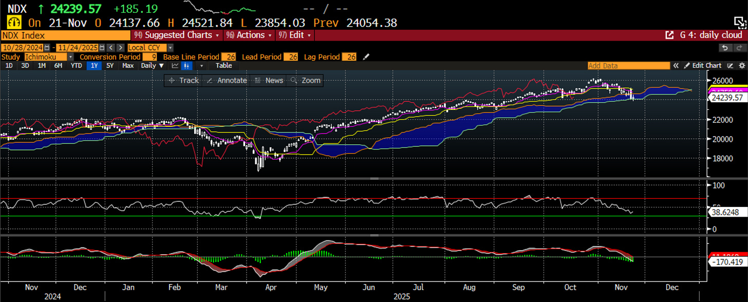 In spite of all of the negativity and poor price action this week, and the dangers that Bitcoin points toward, the NDX Index has yet to break support. This keeps me from getting too bearish at the moment. While crypto has clearly broken and looks like the market is testing the crypto treasury stocks and people like Michael Saylor and Tom Lee, so far, the stock market has been somewhat resilient.