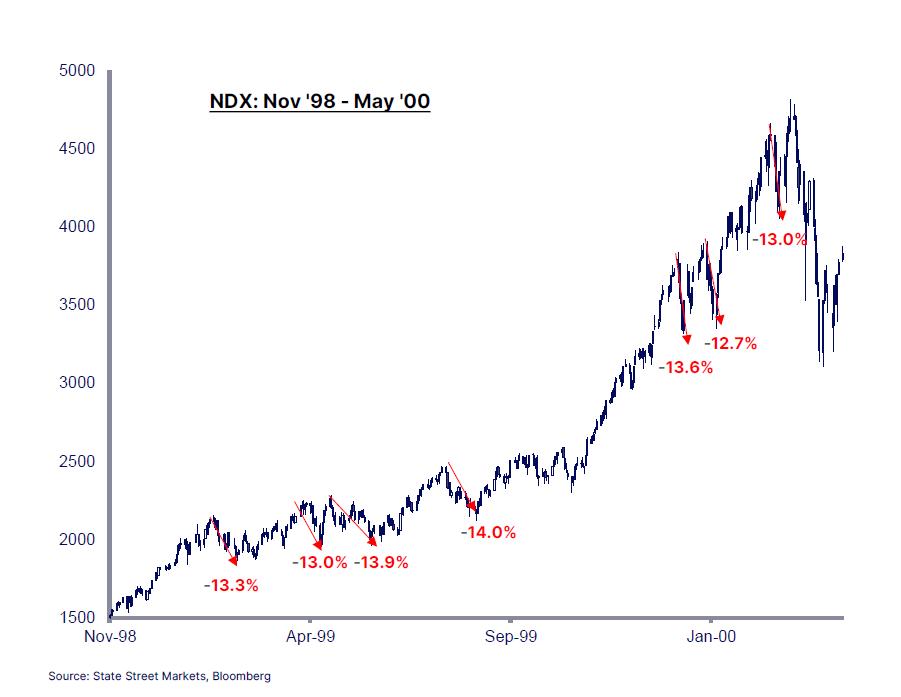 It is often the cases that markets take a step back too. One chart shared with me by Mr. Risk showed that in the Tech Bubble, there were 7 corrections of 12.7-14%. In each the market continued to new highs before, the final bust, where the first wave lower was more like 40%. Thus, neither bulls nor bears are wrong based on the price action just yet: