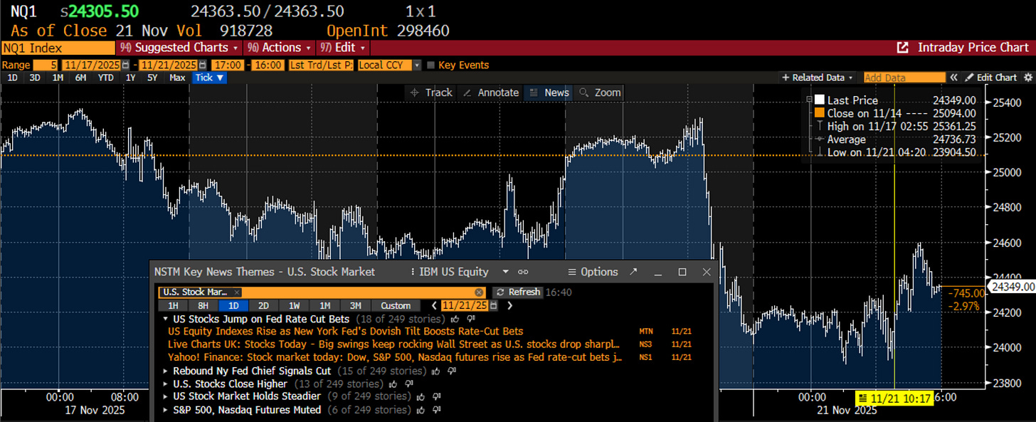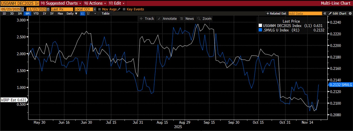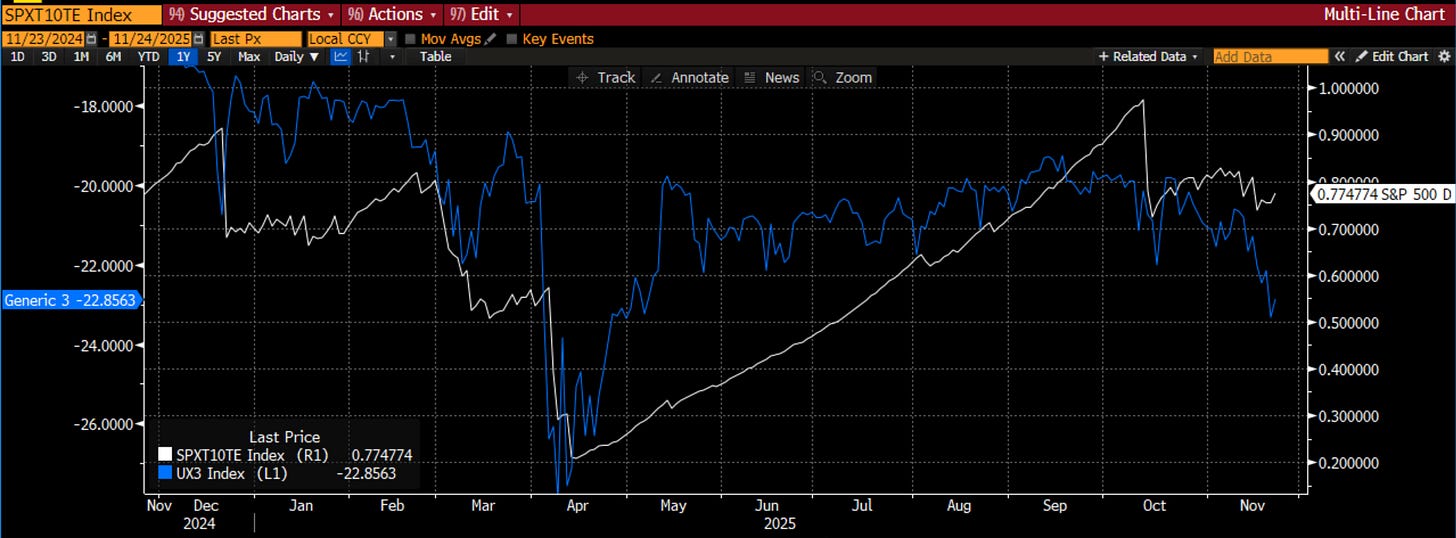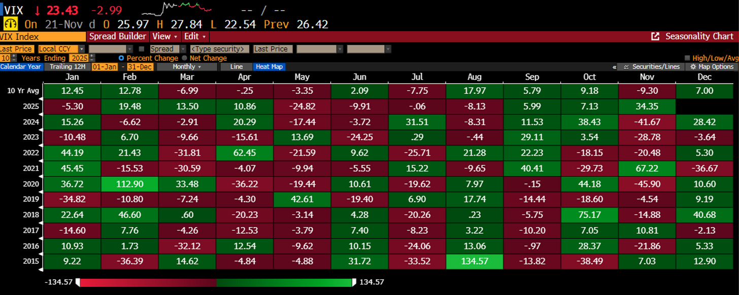 It is worth noting, though, that the VIX was lower on Friday and the hedges I heard were taken off all revolved around the VIX. With a holiday-shortened week ahead of Thanksgiving, and likely so reduced position-taking among traders and investors as we move into December, there may be less of a need for hedges, and so maybe the VIX will not move that much higher, so no need for vol control funds to sell stocks. Perhaps.
