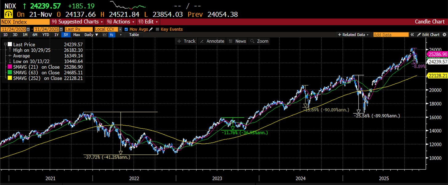 In fact, the current correction is less than the “steps back” that we have seen in 2023, 2024 and earlier in 2025, yet each of those saw new highs set: