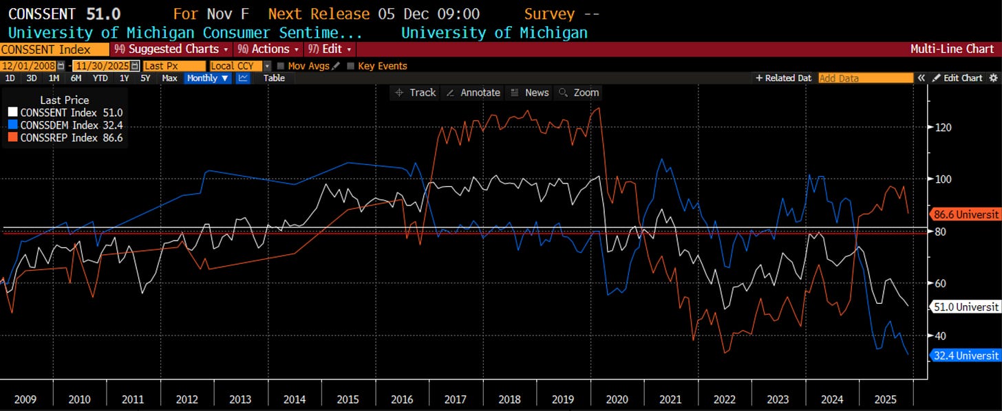 Perhaps the most widely-shared chart this week was of the University of Michigan Consumer Sentiment, which hit a 3.5 year low. This was cited as confirmation that both the weakening labor market and the K-shaped economy were about to spell doom for the market: