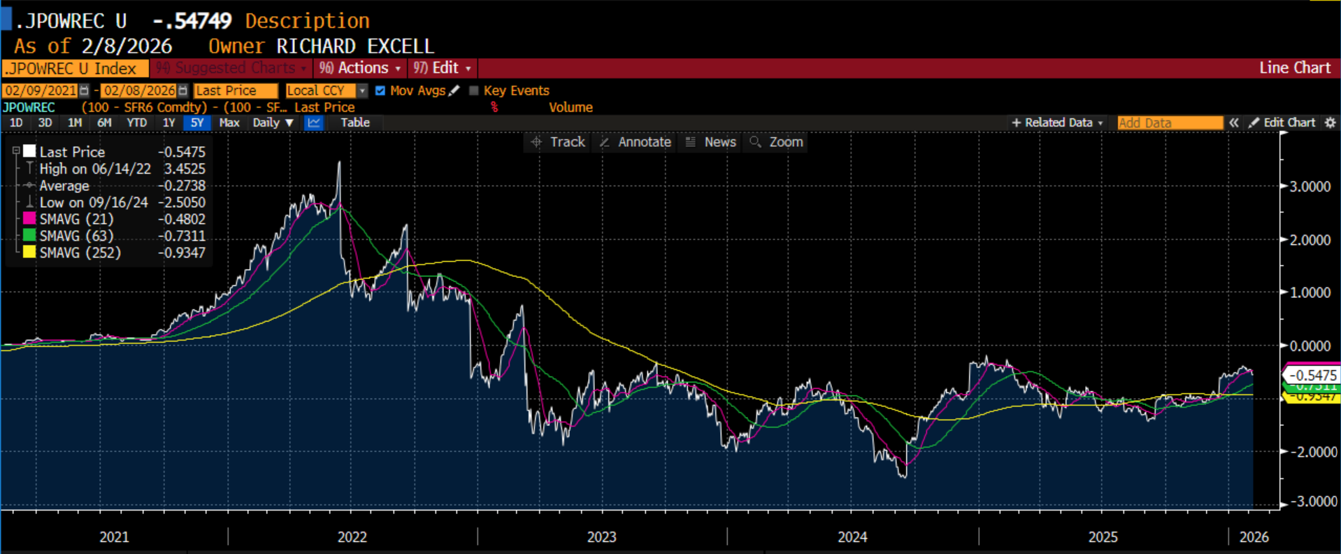 Does the Fed know this? I think a lot of what we are seeing is the lagged effect of rate cuts over the past 18 months. This is likely why the FOMC stayed put, not for political reasons as many suggest. In fact, if we look at the Jay Powell recession indicator which he told us about a few years ago, it is still not back to positive territory but it is trending in the right direction: