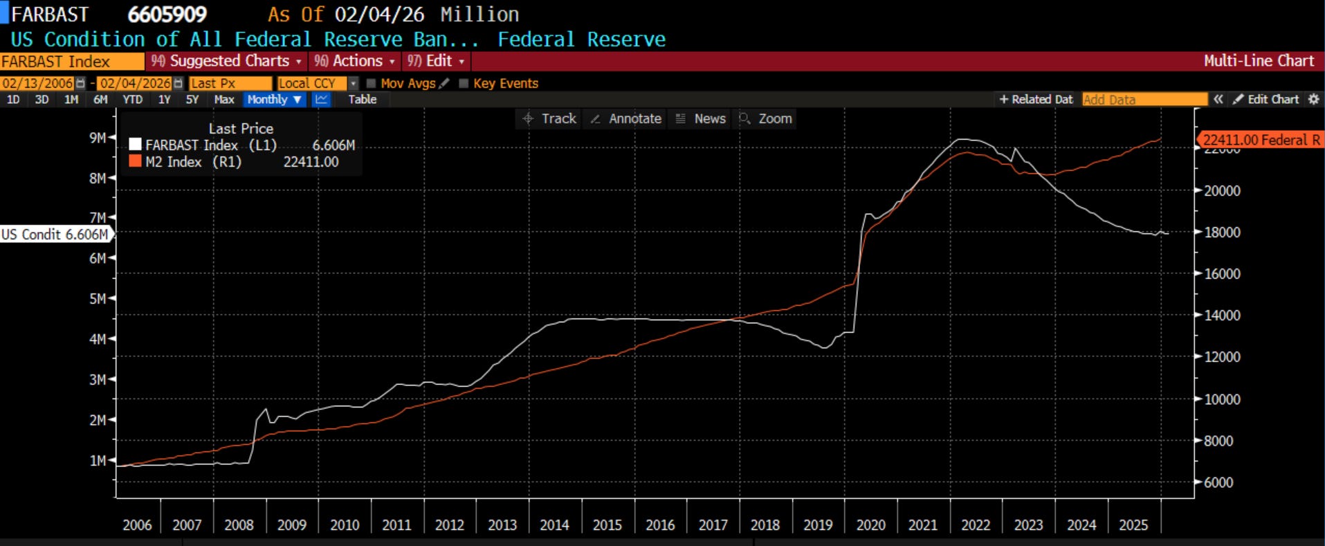 With the nomination of Kevin Warsh as Chair of the FOMC, another market narrative which matters in this debate is his hawkishness. I think more are coming around to the ideas of Barry Knapp, who we referenced last week. If Warsh is a hawk on anything, it is the Fed Balance Sheet and quantitative easing. Is reducing the Fed balance sheet a disaster for markets? I don’t think so at all. In fact, I think it is healthy longer term. While I have been a hawk on rates for a year now, I can actually get behind rate cuts if they are done in conjunction with quantitative tightening. At $6.6 trillion, the balance sheet is still double the pre-Covid level and 6x that of pre-GFC. At the time QE was first announced, Ben Bernanke drew the equivalence of $600 billion in QE was roughly the same as 75 basis points of rate cuts when asked if he would take rates below 0. I don’t believe this has been updated but if the FOMC were to reduce the balance sheet by $3 trillion to get to pre-Covid levels, would it need to take rates to zero to offset the effects? This seems a little too egregious, but one can see that several more rate cuts in conjunction with balance sheet reduction likely would not be stimulative. As we SHOULD know but don’t seem to know based on the conversation I see, it is not the FOMC and Fed balance sheet that leads to money supply growth and debasement. Money supply growth is driven by the extension of credit by the commercial banks. Yes, QE adds bank reserves, but as we saw after the GFC, banks don’t have to lend that out. We have see M2 money growth in the past in periods of QT and are again right now: