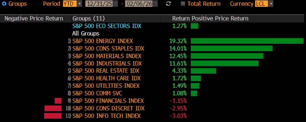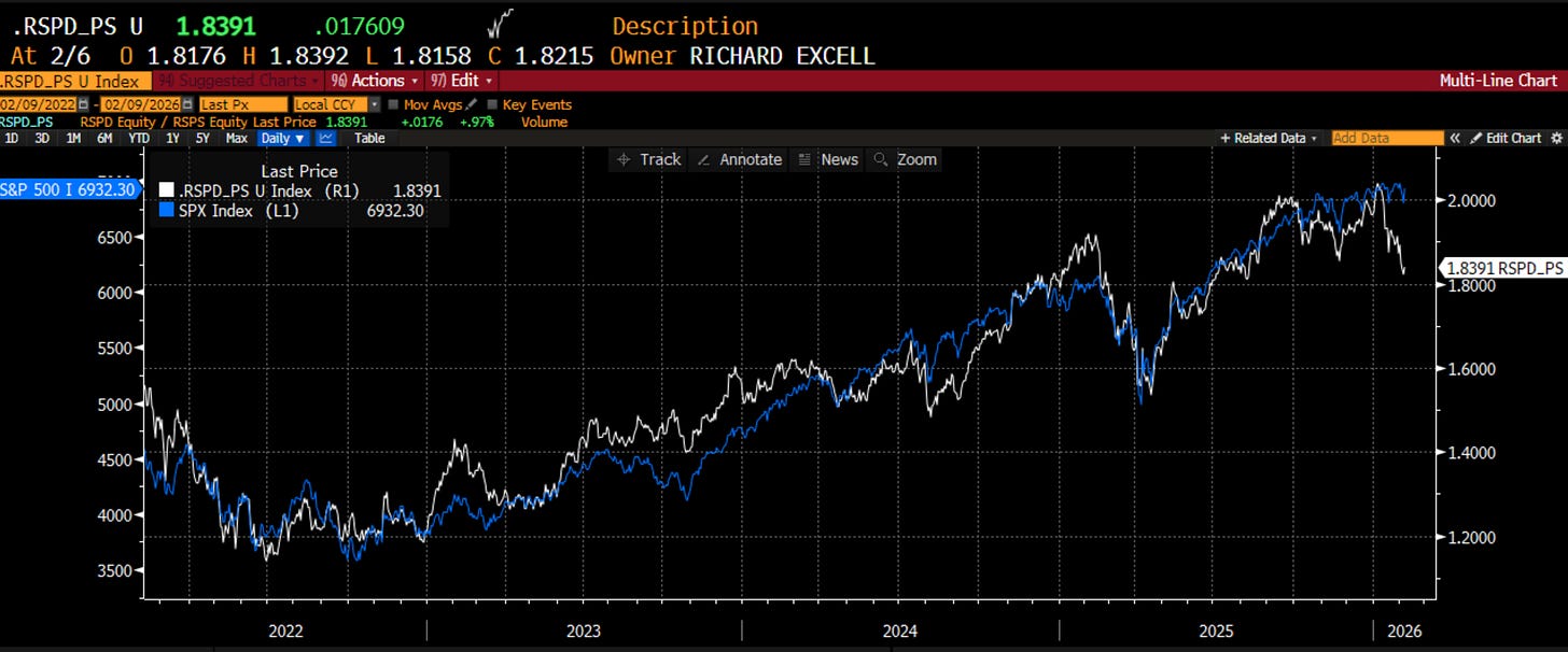 As always, the real action in markets happens beneath the surface and not in the headline indexes. In another clear sign of changing investor preference and rotation of assets, investors have materially shifted focus out of Technology and into Energy, Materials and Industrials. With the news from Alphabet and Amazon about hundreds of billions in data center capex, investors are showing a preference for the picks-and-shovels vs. those that have to pay the bills.