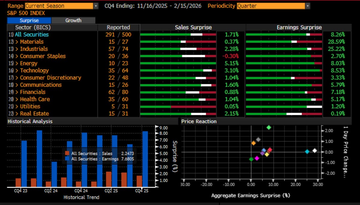 “According to FactSet's latest Earnings Insight report, the blended earnings growth rate for Q4 S&P 500 EPS currently stands at 13.0%. This is above the 8.3% expected at the end of the quarter. The blended revenue growth rate is 8.8%. Of the 59% of S&P 500 companies that have reported for Q4, 76% have beaten consensus EPS expectations, below the 79% one-year average and the five-year average of 78%. In addition, 73% have surpassed consensus sales expectations, above the 71% one-year average and the five-year average of 70%. In aggregate, companies are reporting earnings that are 7.6% above expectations, better than the 7.4% one-year average positive surprise rate but below the five-year average of 7.7%. In aggregate, companies are reporting sales that are 1.4% above expectations, above the 1.3% one-year positive surprise rate but below the five-year average of 2.0%”