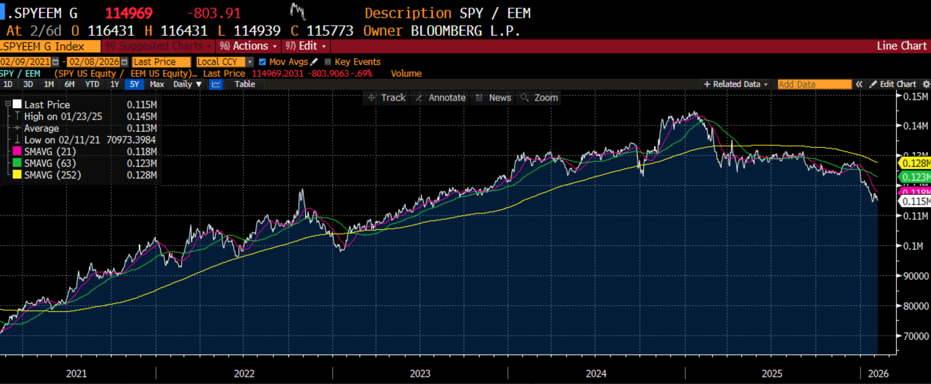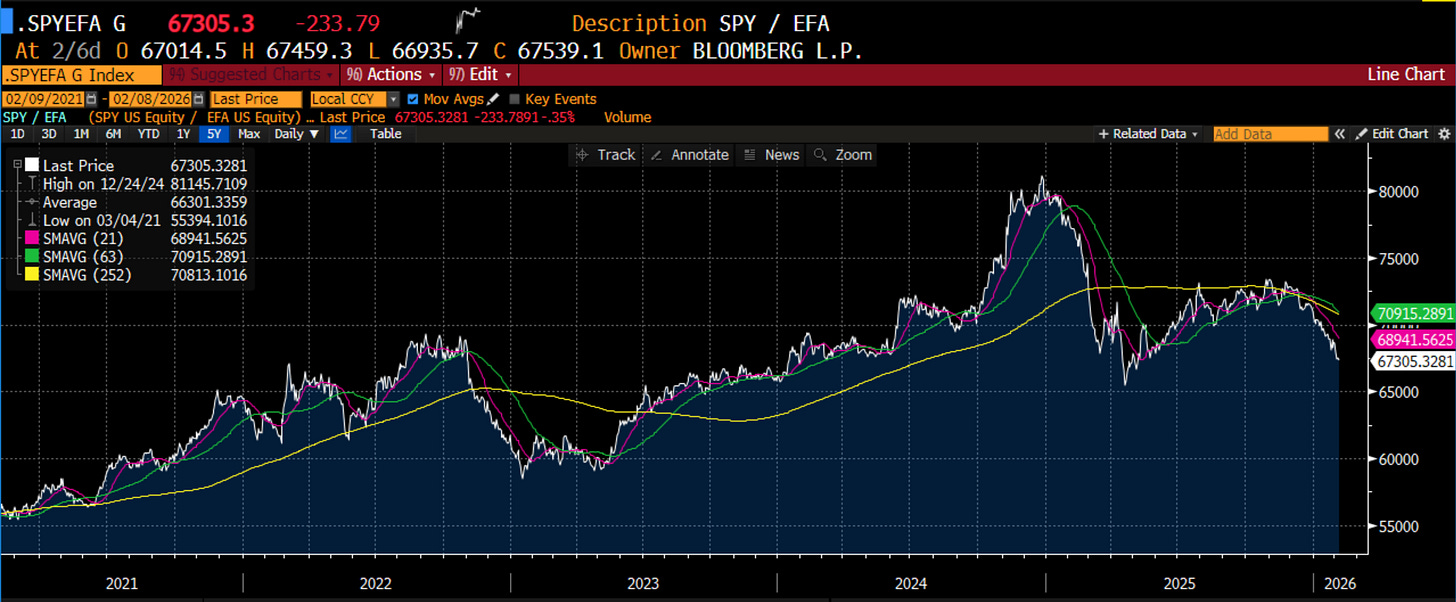 In fact, if we look at the relative price of SPY vs. EFA, which is the rest of the developed world, we see price action that we would likely sell if it was an individual stock. During the Liberation Day meltdown in Q1 of 2025, SPY broke below the 200 day moving average. It then bounced back over the summer but has tried several times to break through that moving average resistance and has now failed, giving way to a relative move to the downside. Not drawn, but if you prefer trendlines, the line from the 2023 relative low through the 2025 relative low has also given way targeting a return to that 2023 low in simple terms.