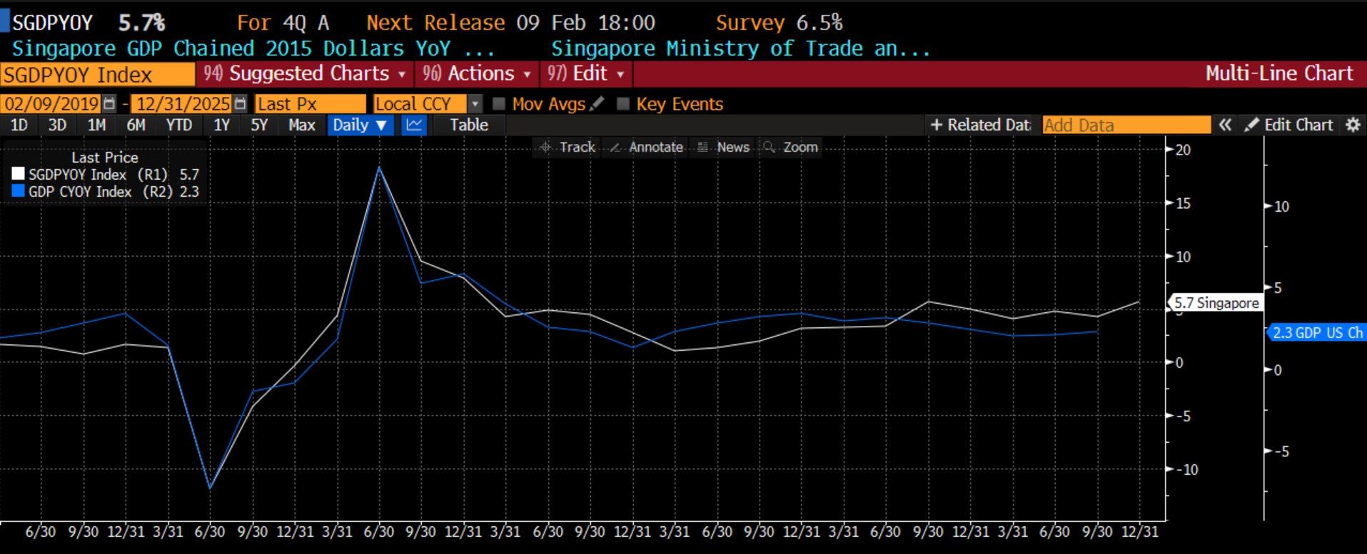 Is global growth really that good? One place I like to look is Singapore as a leading indicator. I had the good fortune of living in Singapore for 7 years, and besides the fact I loved it there, I learned very quickly that Singapore is heavily influenced by global growth. Shipping, energy, technology, finance are all major industries in the country as the nexus for all global activity. The Singapore GDP leads the US GDP as we see below. We will get an update on the Singapore GDP this week and I will be watching intently. Right now, it is signaling full steam ahead for global growth: