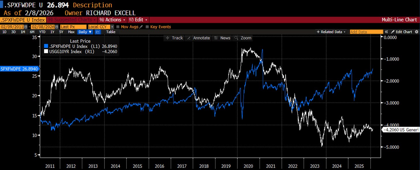 Supportive growth and the potential for inflation likely mean the US 10-year yield will have trouble to fall. This is important for equity markets because it means that earnings multiples probably only have one direction from here. You all know how disconnected multiples have been, and this is contributing to the rotation out of technology as the bar has been set perhaps too high. Falling multiples are a headwind for stocks, mostly in the US, mostly in tech: